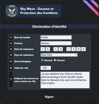- Dirigez vous auprès du douanier et entamez la conversation. Le douanier vous présentera un document où il vous faudra inscrire les informations liés à votre personnage RolePlay. N'inscrivez rien de HRP dans ce document.