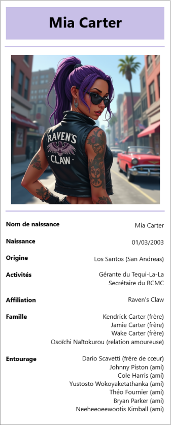 Mia Carter est la secrétaire du Raven's Claw Motorcycle Club et gérante du Tequi-La-La, un bar situé à West Vinewood. C'est une jeune femme noire américaine avec un fort caractère et quelque peu maladroite.