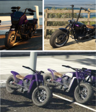 Exemple de motos utilisées par le RCMC ; en haut a gauche, la Daemon, a droite, la Krust et en bas la Gargoyle